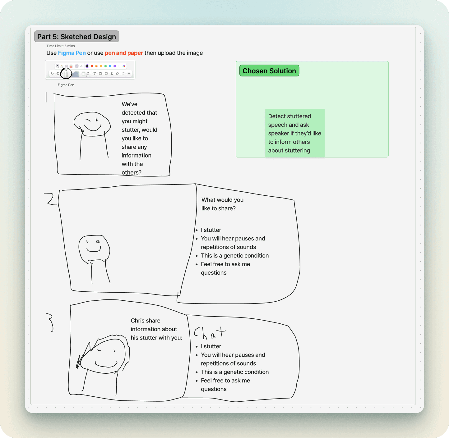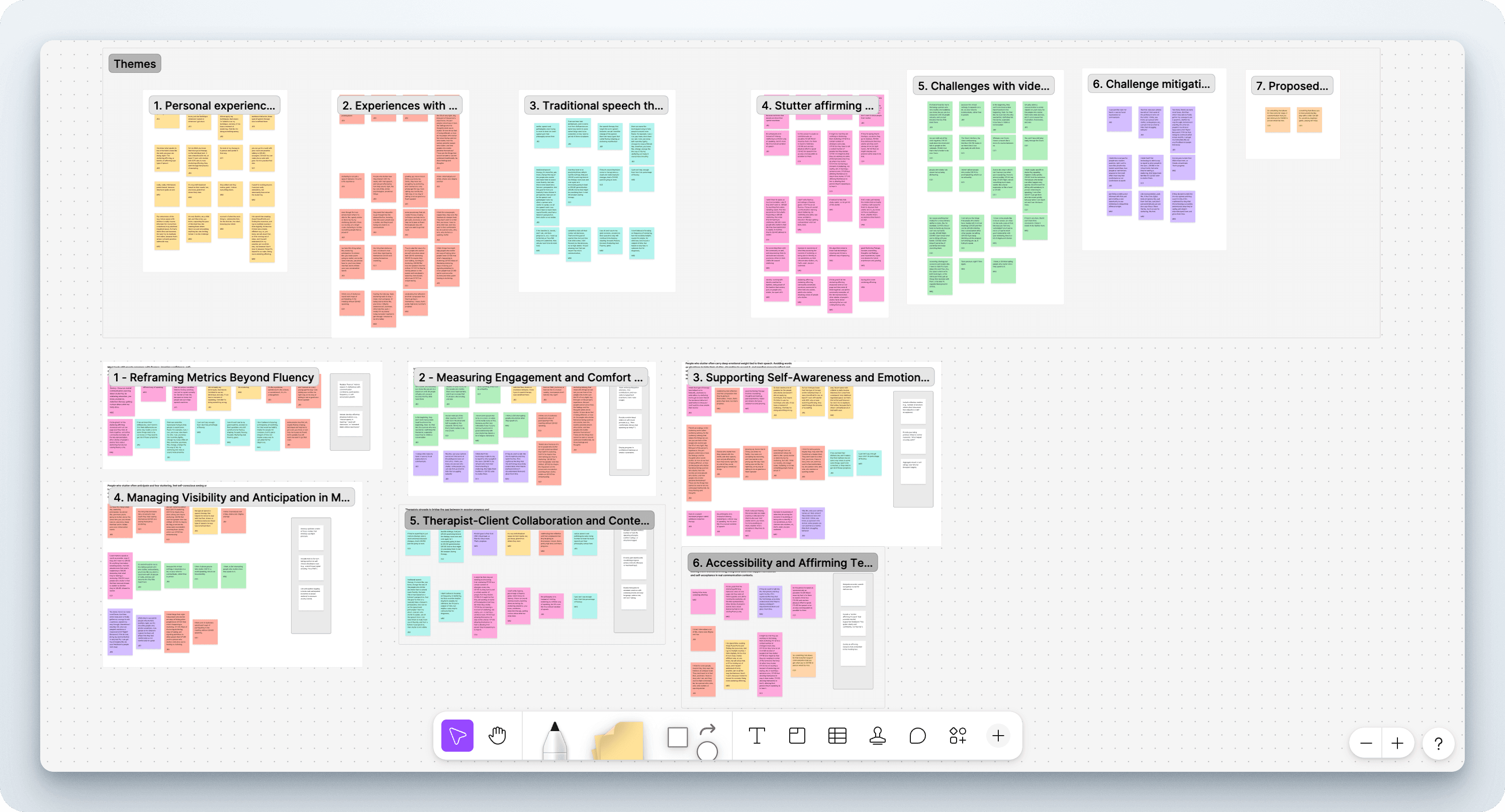 We started by organizing our research into clear themes that captured repeated patterns across people who stutter and speech-language pathologists. With these themes in place, we brainstormed a wide range of ideas, then grouped and refined them into a small set of core directions.