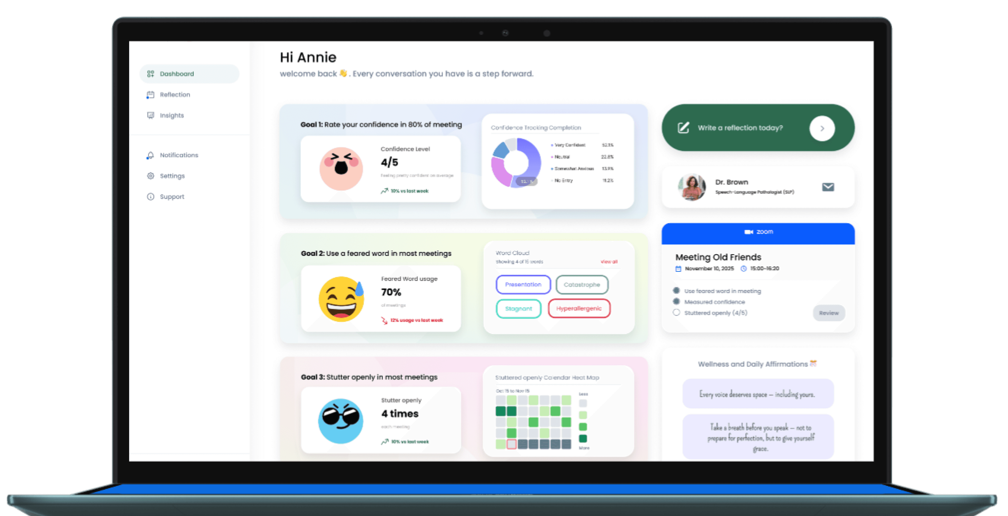 Most tools prioritize speech correction or performance metrics, which can increase pressure and stigma. This makes it difficult to apply therapy strategies in real meetings and limits insight between people who stutter and their therapists.