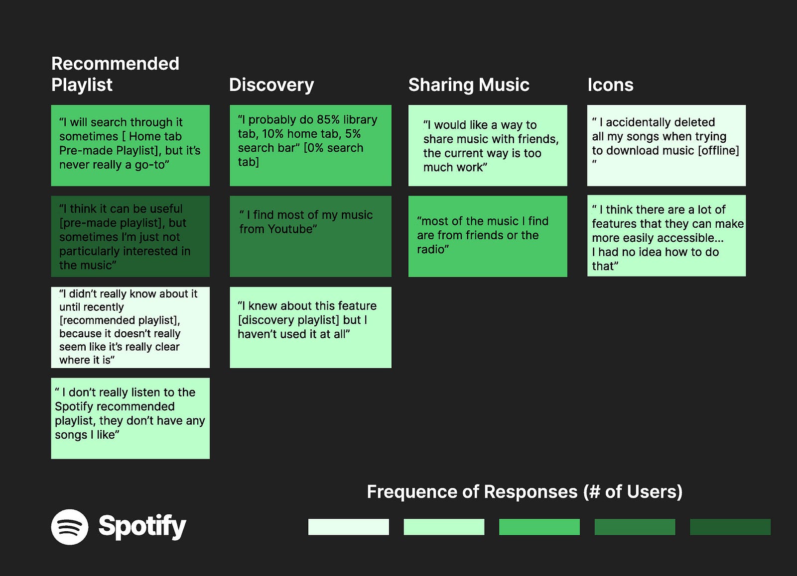 Looking at the frequency of the different responses I got from my audience, it was obvious that users weren't utilizing the Spotify recommended playlist but rather going off and finding their own music. Additionally users were more likely to find music through Youtbe or friends. They described Spotify as more a holder for their music rather than a means to discover music.