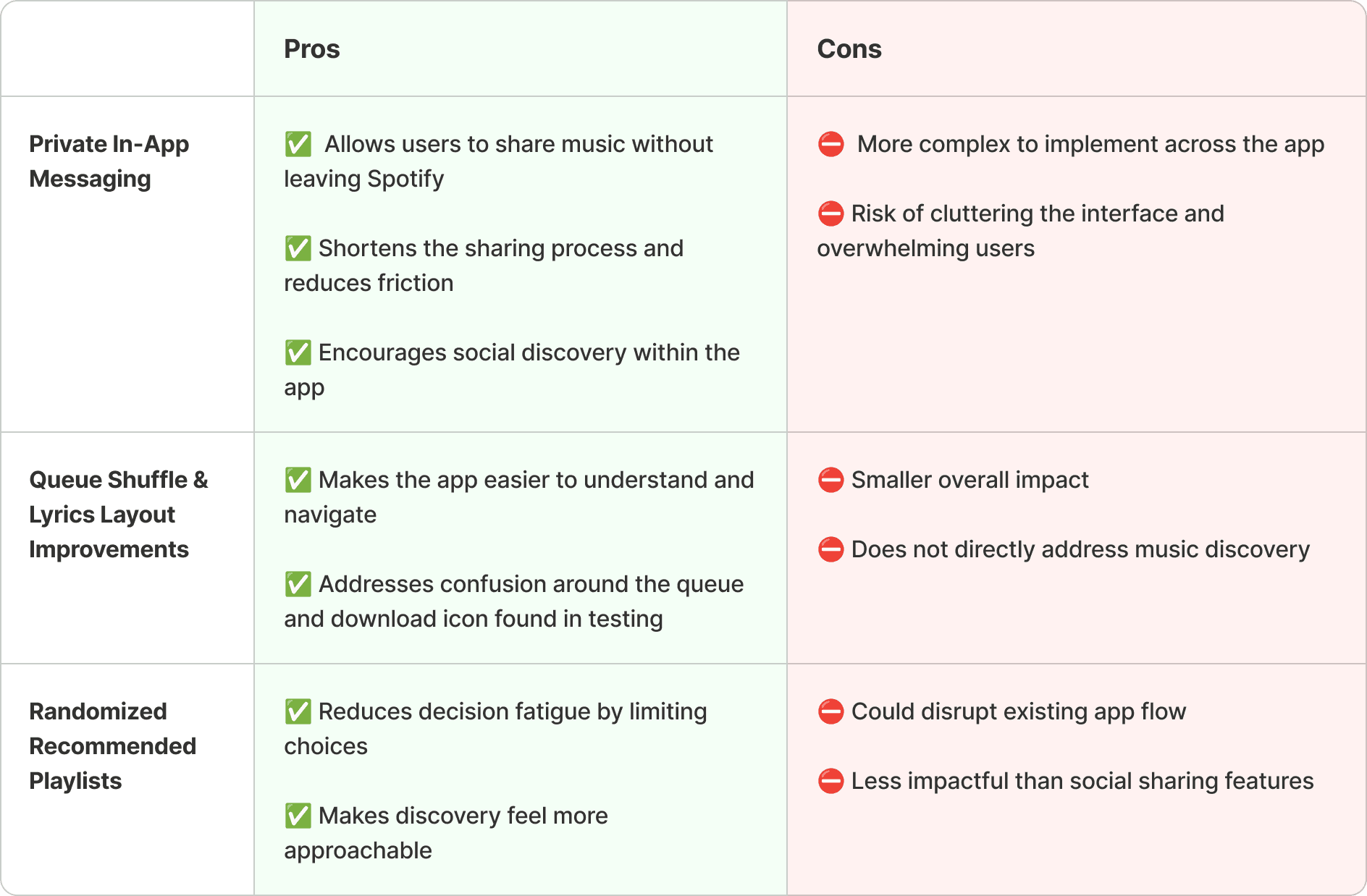 I chose the first feature as my final solution. I thought that creating a private messaging system on Spotify has been long called for. Private messaging would make it easier for users to share and listen to music as a collective. As people usually find music through other people, this would make it easier to discover music since everything is on shared medium. I think this feature would also increase the screen time on users since now users can enjoy music with their friends directly on the app.