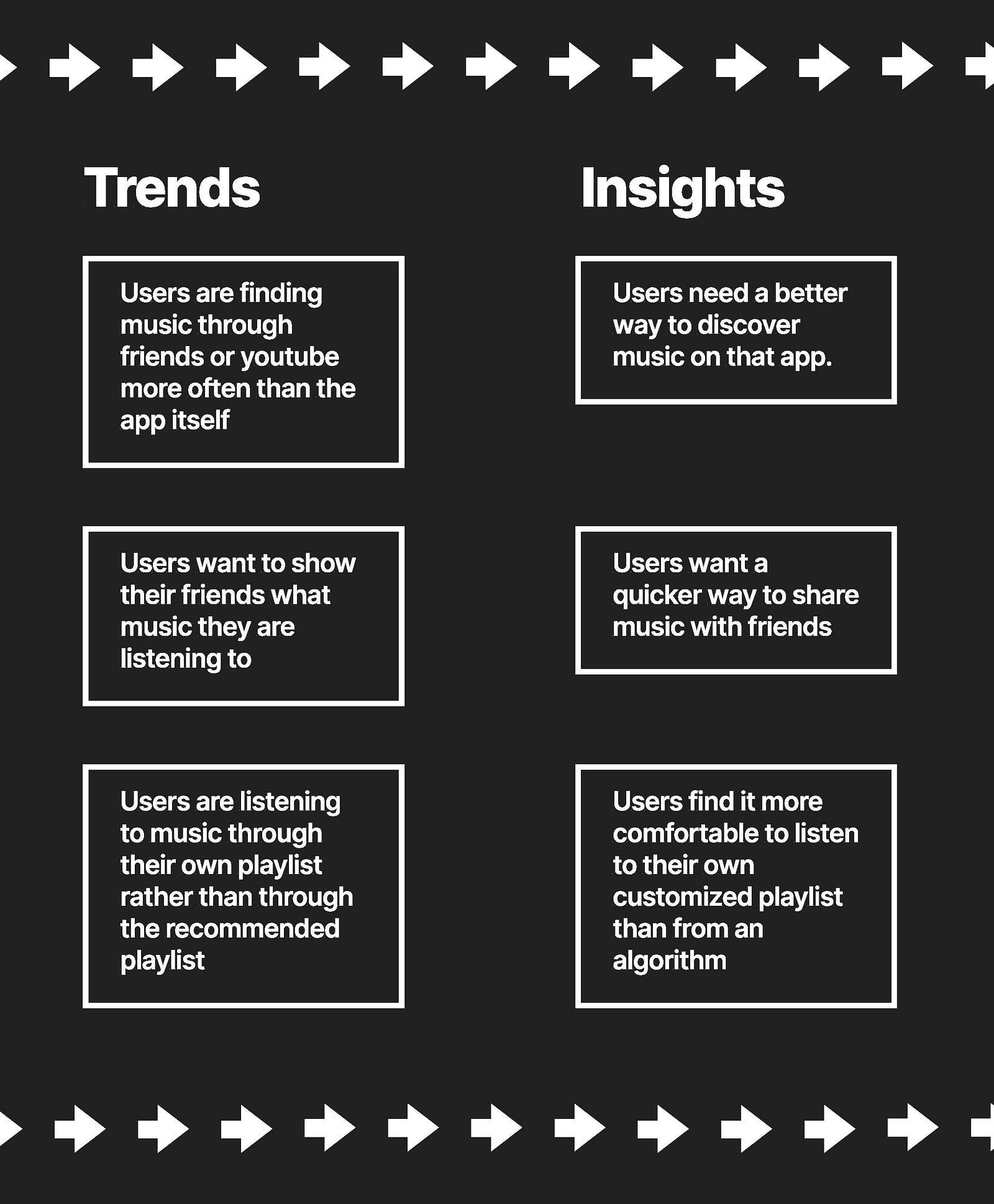 Many of the interviewees also said that they found music through friends. This is a common pattern where users would send songs to their friends and would themselves find music through the same process. Interestingly, one of my users suggested that they found the sharing process tedious and annoying to do. This sparked some ideas to simplify the sharing process Spotify currently has.