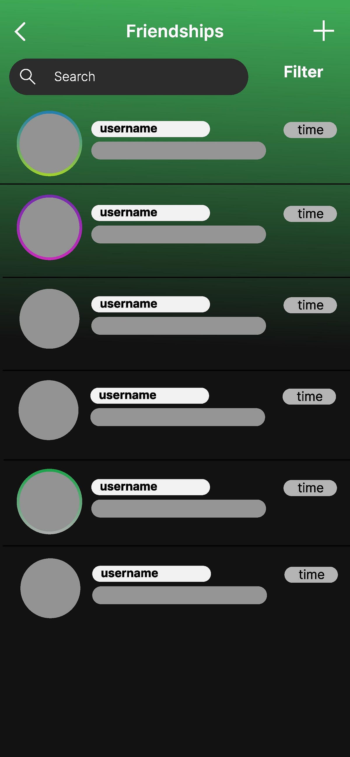 This was the original sketch of the feature. Users would enter the app through a mail icon at the top right corner. Here they would be transported to the inbox page where they can see all their recent messages. Another idea I had to go along with this feature was the ability to see your friends who are also active on Spotify. This would also be placed on the home screen, similar to Instagram. Lastly, I also thought the idea of having the stories/friend-activity be clickable entryways to your friends profile. Here, it would show the current song they are listening to and what their favorite artist are for the week.