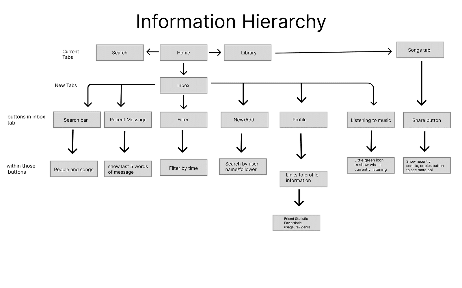 If I had had more time I would have also created a way for users to interact with their friend's profiles. I think that messaging/inbox is associated with the idea of friends and profiles. The current Spotify design doesn’t maximize the social aspect. Spotify currently keeps track of how what songs or genres you listen to. Why not put that information in the public, right on your profile?